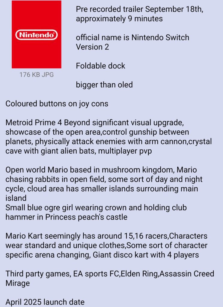 The user also listed some new games coming to the new Switch, including an open world Mario game and a new Mario Kart.